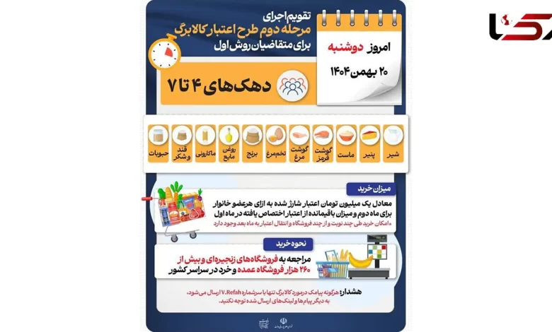 بر اساس اعلام وزارت تعاون، کار و رفاه اجتماعی، متقاضیان روش اول در دهکهای ۴ تا ۷ وارد مرحله دوم خرید با اعتبار ماهانه یک میلیون تومانی کالابرگ شدهاند. در این مرحله، اقلام مشخصی از کالاهای اساسی قابل خریداری است و قوانین خاصی برای استفاده از اعتبار حاکم است.