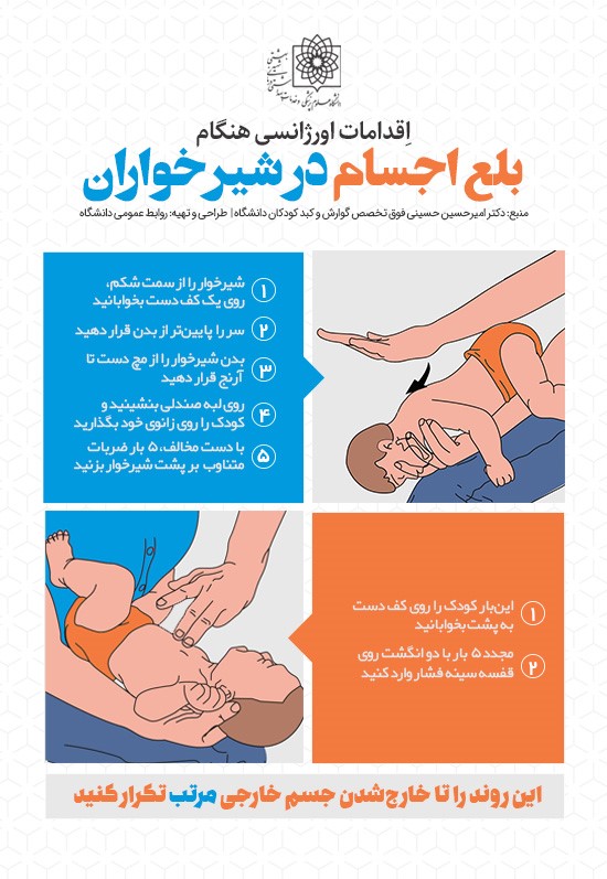 فوق تخصص گوارش و کبد کودکان دانشگاه با اشاره به این که خارج کردن اجسام خارجی در شیرخواران و کودکان کمتر از یک سال روش های دیگری دارد. ادامه داد: در شیرخواران زیر یکی دو سال، شیرخوار را از شکم روی ران بخوابانید. سپس با دست دیگر ضربات متناوب پنج بار بر روی پشت شیرخوار وارد کند. سپس کودک را روی کف دست برگردانده و این بار پنج بار با دو انگشت روی قفسه سینه را فشار دهید و این کار را مرتب تکرار کنید تا جسم خارج شود.