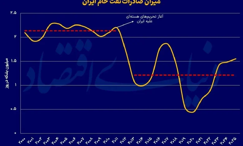 • میانگین صادرات نفت ایران از سال ۲۰۱۲ تا ۲۰۲۵ روزانه حدود یک میلیون بشکه کاهش یافته است.