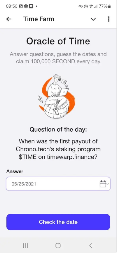 پاسخ سوال روزانه پروژه time farm تایم فارم 14 مهر شنبه هم به محض آمدن در اینجا قرار گرفت. کافی است از بخش earn به oracle of time بروید و تاریخی که نوشتیم را انتخاب کنید.