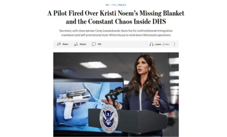 بر اساس گزارش روزنامه وال استریت ژورنال، یک خلبان گارد ساحلی آمریکا به دلیل جا گذاشتن پتوی شخصی وزیر امنیت داخلی این کشور در جریان یک سفر، اخراج شده است. این اتفاق پس از نقص فنی هواپیمای حامل وزیر و جابجایی او به هواپیمای دیگر رخ داد.