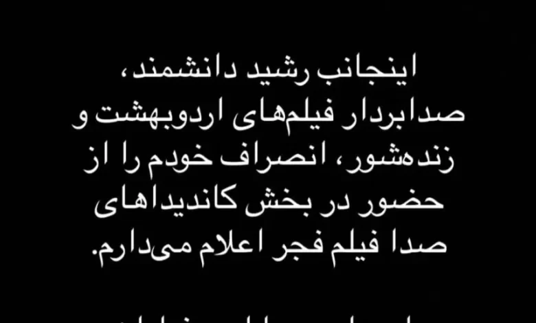 رشید دانشمند، یکی از نامزدهای دریافت جایزه سیمرغ جشنواره فیلم فجر، پس از اعلام رسمی نامزدها، از رقابت در این بخش انصراف داده است.