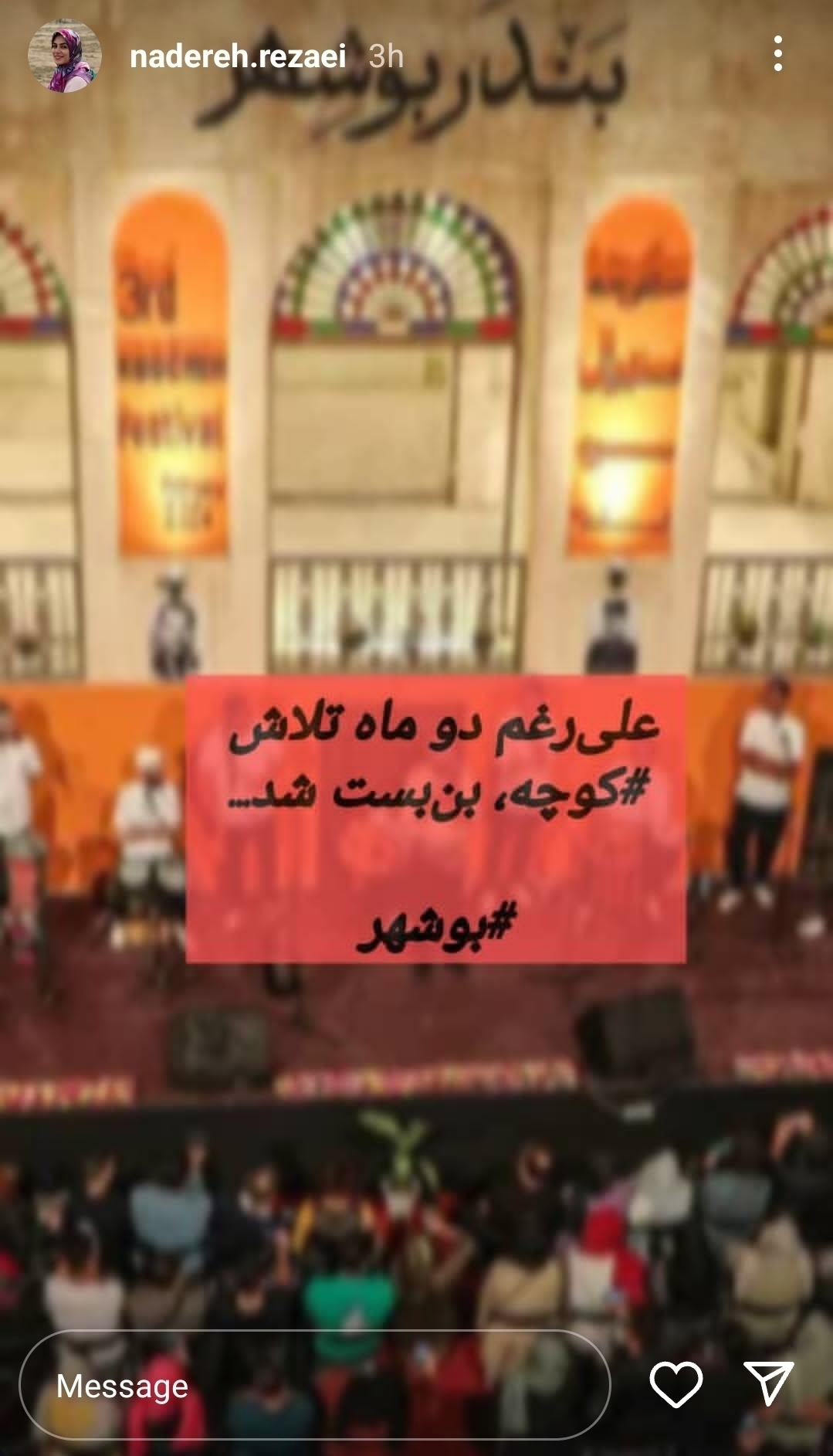 نادره رضایی معاون امور هنری وزارت فرهنگ و ارشاد اسلامی در اینستاگرام خود نوشت: «علیرغم دو ماه تلاش، کوچه بنبست شد».