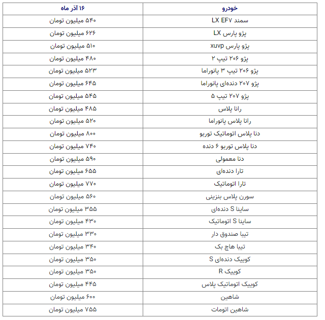 در جدول زیر قیمت خودروهای پرتیراژ داخلی آمده است.