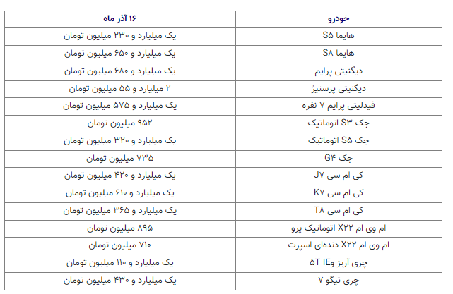 در جدول زیر قیمت برخی از خودروهای مونتاژی آمده است.