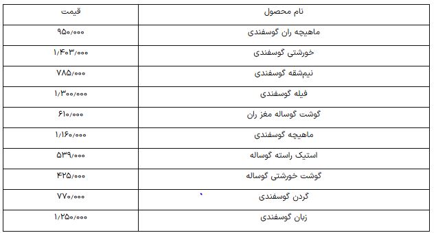 ماهیچه ران گوسفندی در سطح استانهای کشور، با نرخ ۹۵۰ هزار تومان و ماهیچه گوسفندی به ازای هر کیلوگرم یک میلیون و ۱۶۰ هزار تومان به عرصه فروش گذاشته میشود.
