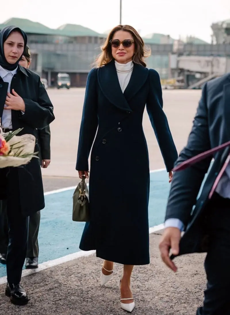 رانیا در این سفر سیاسی، پالتوی بلند کله غازی رنگش را با شومیز شیک یقه ایستاده سفید رنگش ست کرده بود و زیر آن دامنی مخمل و بسیار شیک به رنگ سبز به تن کرده بود. جذابیت این استایل رانیا را کیف سبز او تکمیل میکرد.