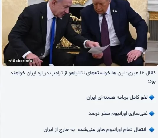 صابرین نیوز به نقل از کانال ۱۴ اسرائیل مدعی شد این شش مورد، خواسته‌های نتانیاهو از ترامپ درباره ایران بوده‌اند: