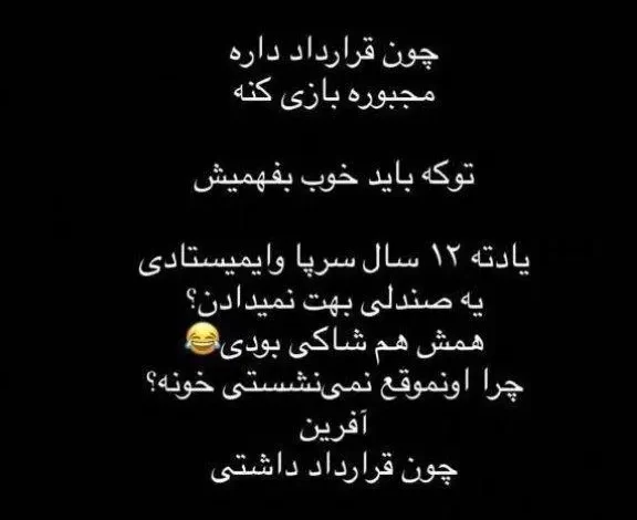 ایمان صفا، بازیگر شناخته شده سینمای ایران، با انتشار یک استوری در اینستاگرام به صحبت‌های محمدحسین میثاقی پاسخ داد. او در این استوری خطاب به میثاقی نوشت: «چون قرارداد دارد مجبور است بازی کند. تو که باید خوب بفهمی. یادت هست ۱۲ سال سرپا می‌ایستادی و یک صندلی به تو نمی‌دادند؟ دائم هم شاکی بودی. چرا آن موقع خانه نمی‌نشستی؟ آفرین، چون قرارداد داشتی!».