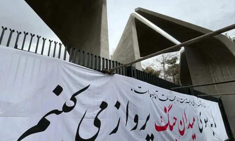 پارچهنوشت جنگی روی سردر دانشگاه تهران؛ پیام «پرواز به سوی میدان جنگ» چیست؟
